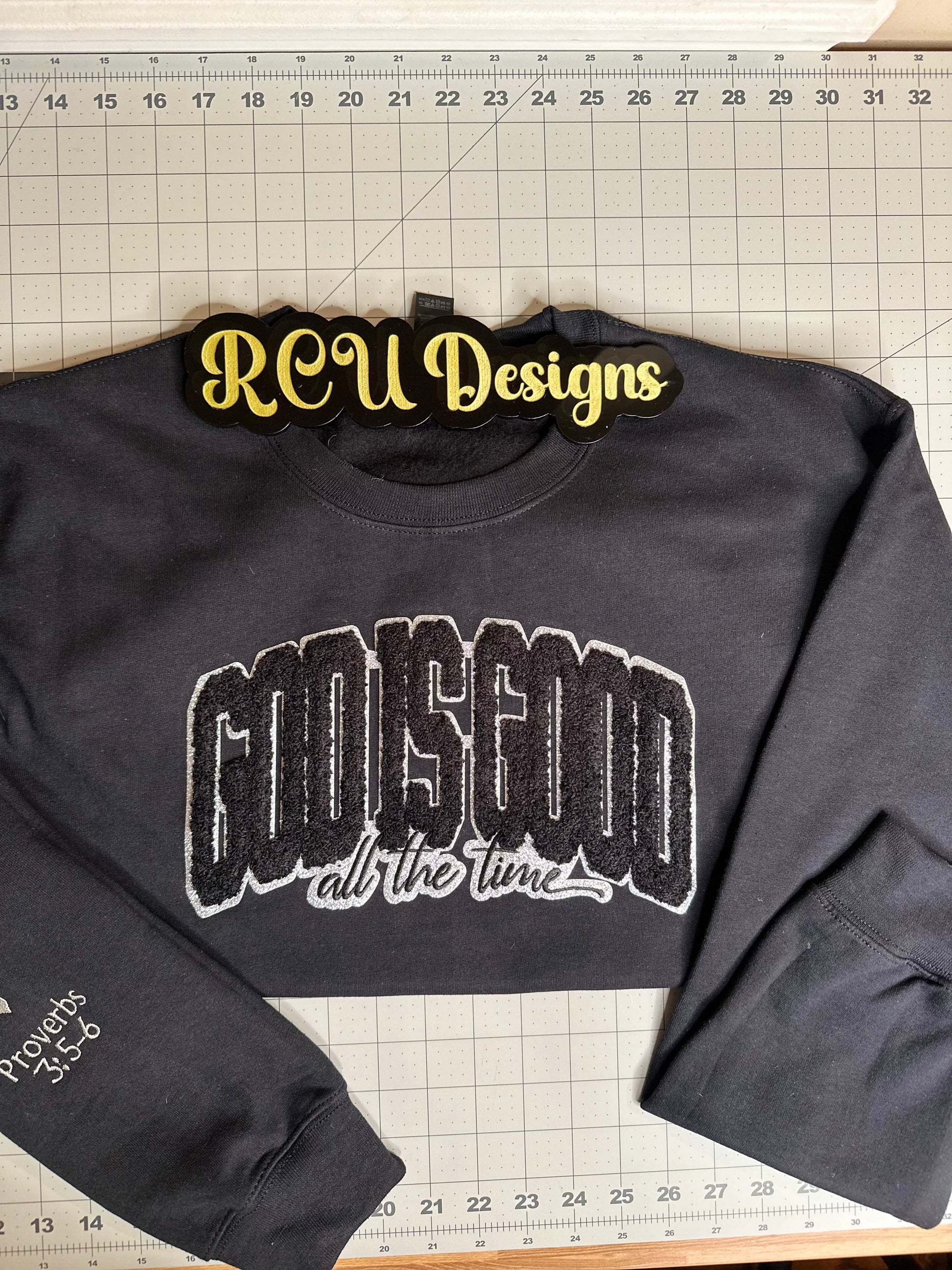 Wrap yourself in comfort and inspiration with this premium black sweatshirt from RCU Designs. Featuring bold, high-quality chenille embroidery that reads "God Is Good" with the uplifting phrase "all the time" underneath, this piece blends faith and fashion effortlessly.